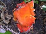 Simply because I found only two small chanterelles and Marilyn didn’t find any. I put these golden delicacies in scrambled eggs this morning. “Scrambling” also is a good description of what we did yesterday on the salal and fern-covered hillsides, but instead of finding ingredients for the saute pan we mostly came across patches of giant, neon-orange fungi. Come to think of it, I guess these woods did hold a few creepy mysteries after all