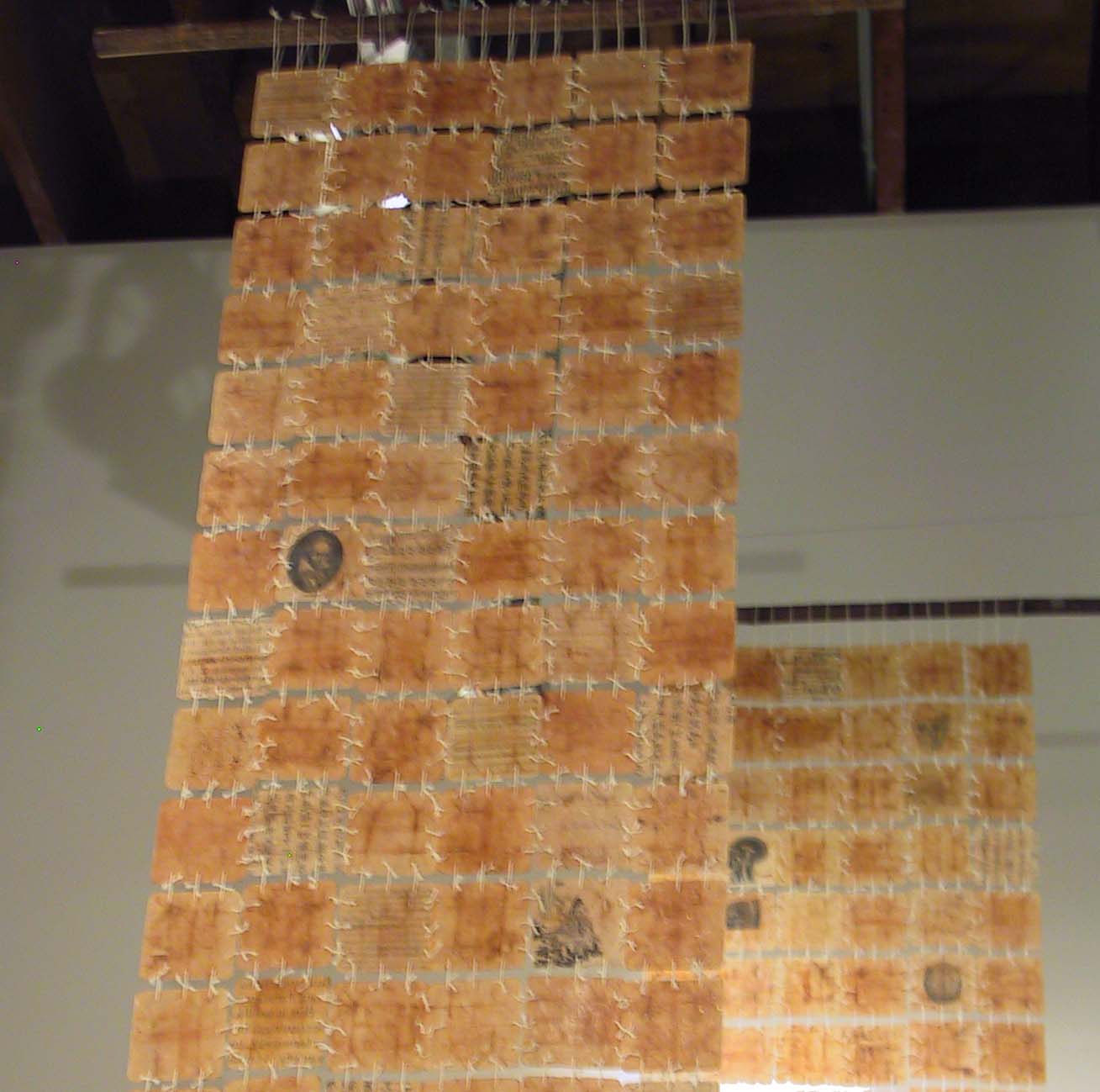 The art piece that members of my tour group were most taken with was a tea bag tapestry called MEM: memory • memorial no.7 scriptorium, by Naomi Kasumi. Specifically, the tapestry sections were made from used tea bags (politely called recycled tea bags in the flyer) and inscribed with Japanese characters.  The artist used thread to tie the tea bags together.  While we didn’t come out and say, “We could do that,” we all want to learn more about how Kasumi did it, just in case.  I commented that I couldn’t imagine how used tea bags would work, as they so wrinkled when they have dried out.  Someone in our group said, “I imagine you have to iron them.”  I was then imagining myself at home, working on this project when the phone would ring.  It would be a friend calling.  “What are you doing?” she would ask.  “Oh, just ironing dirty tea bags,” I would answer.  If I ever attempt to make a tapestry, I think I’ll keep quiet about it until it’s completely finished, or at least not answer the phone while I’m working on it.