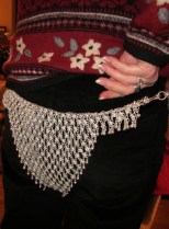 In year two we again failed. The fact that our broken Nutcracker Man was considered a top-rated prize was clearly an indicator of the tastelessness of the other gifts, including the metal belly dancer panties that we won (seen modeled here). So this year we came prepared. I marched in proudly and announced that we had finally mastered the art of gift selection for this event: a hideous work of wood carving and last year’s metal panties.