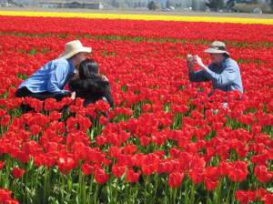 The Skagit Valley Tulip Festival website boasts that one million people a year attend this event every April.  I believe they all came today.  Who can blame people for wanting to take a road trip on this, the warmest, sunniest day of the year?  The traffic jam began about thirty miles south of the tulip fields.  Some cars spilled off from the freeway at the Tulalip Casino, gambling indoors apparently being another good way to spend the only sunny day we’ve seen in months, but the congestion returned a few miles later.  There was a big back-up to exit the freeway and long waits at stop signs along the country roads.  However, none of this dampened our enthusiasm.