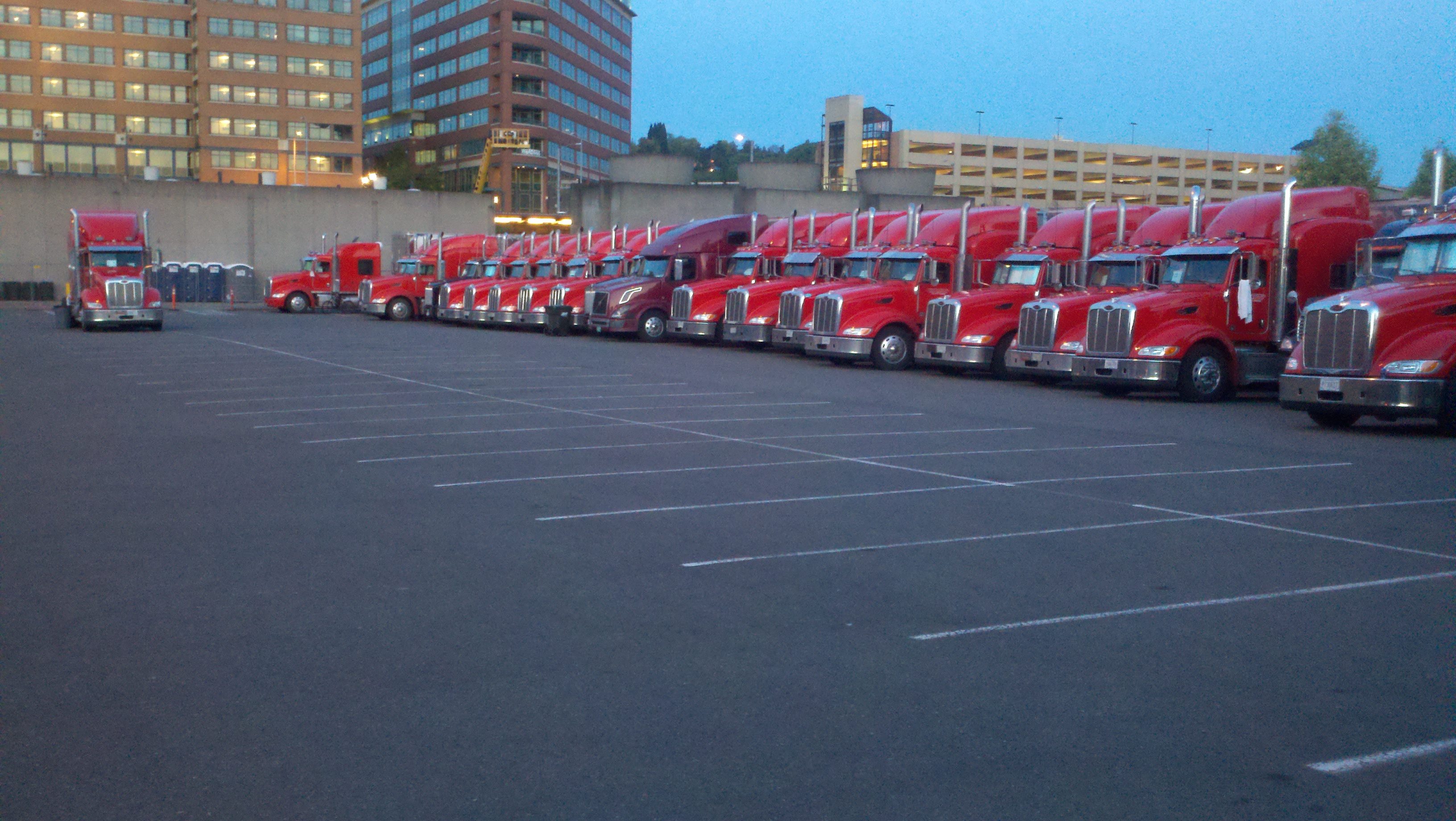 Perhaps she could be an inspiration to Bono and U2, who are performing tonight in Seattle and bringing with them ‘The Claw,’ “a 164-foot-high steel support rig,” according to an article by Charles R. Cross in the Seattle Times. The Claw fits into just 120 trucks including these in the photo. But what about the guitars, amplifiers, microphones, lighting and roadies? I wonder how many suitcases they fit in? Another traveling entertainment, the Barnum and Bailey Circus, requires 60 train cars to get from city to city, but it can be excused; it has some very large performers.
