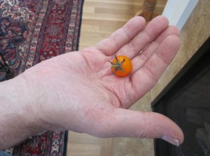 Today, our first truly sunny day, my husband went out to cut off the gray, moldy or blighted branches, which caused one tomato to fall off. We divided it in half for each of us to sample. “Sweet, but a little watery,” I said. He liked it, so I went out to pick its twin which was still clinging to a branch. As of today, we have enjoyed this year’s tomato harvest. Thanks to my husband’s bumping into a plant and knocking one tomato to the ground, you could say it was a bumper crop.