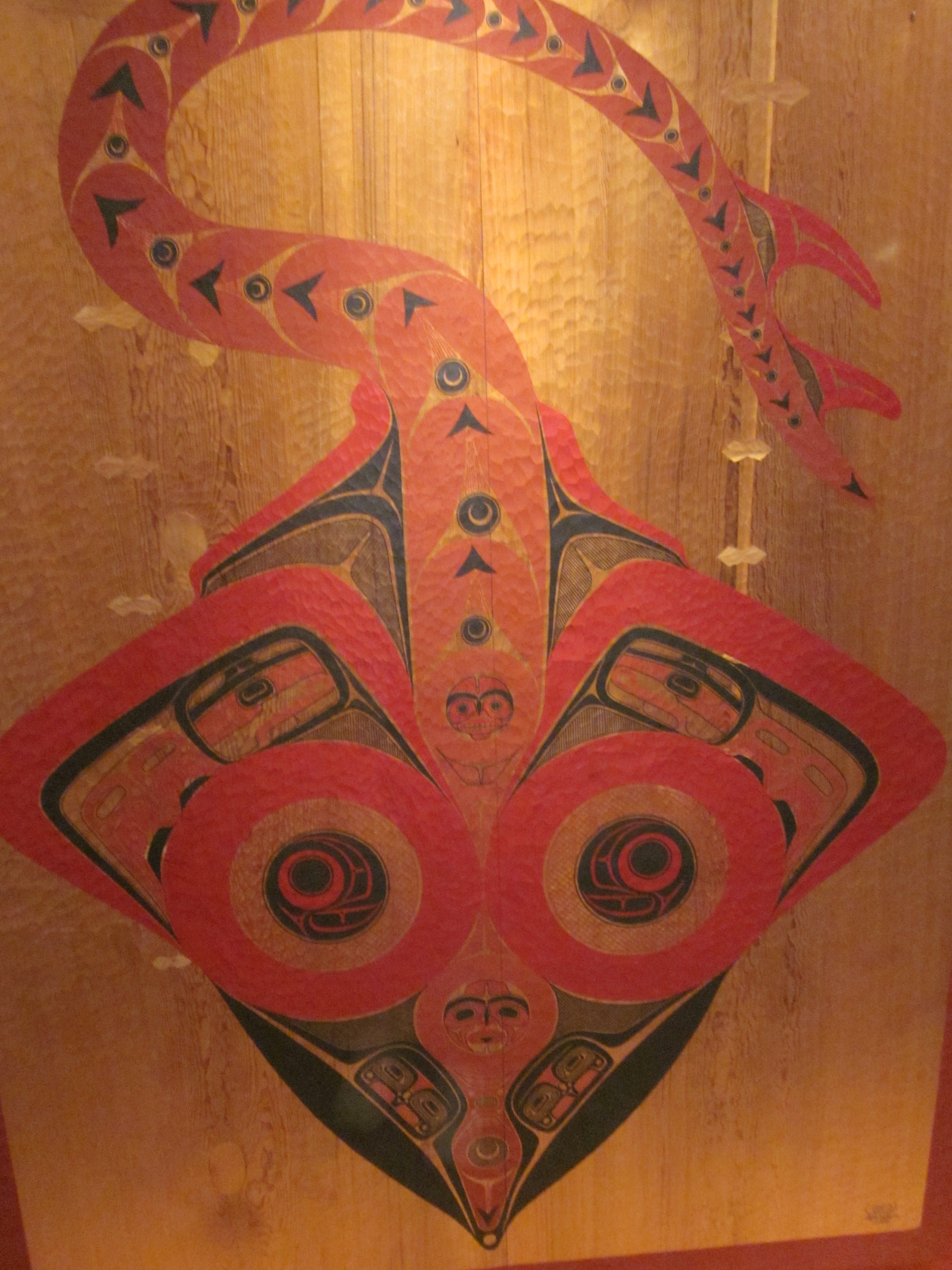 We are staying in the Listel Hotel, which prides itself on its art collection. According to its literature, it has a reputation as Vancouver’s “most art-full” hotel. The two pieces in our room, along with a third that greets us as we exit the elevator on our floor, are what we in the U. S. call Northwest Native American art and Canadians call First Nations people’s art or Aboriginal art.