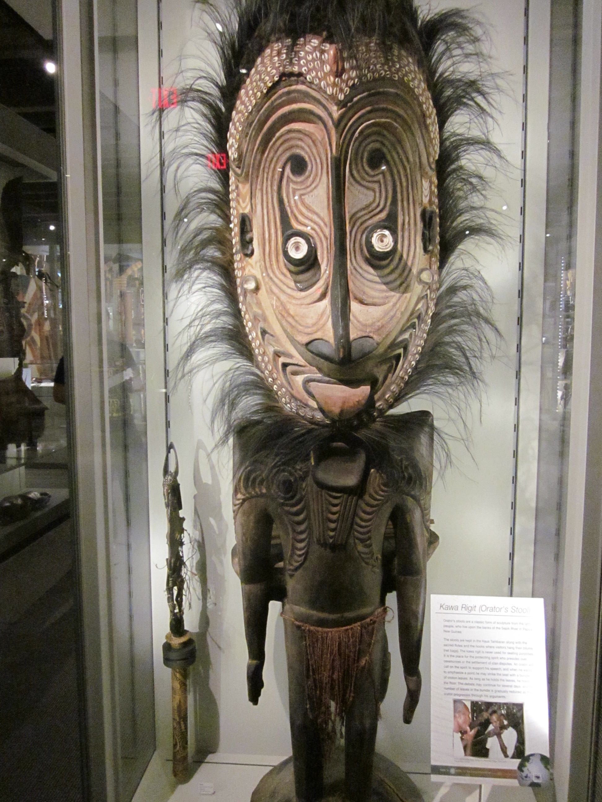The last exchange was more personal than artistic. Text, photos, and objects told the story of a “reconciliation ceremony on the island of Erromango in the South Pacific Republic of Vanuato.” In 1817, two English missionaries, mistaken for traders with evil intentions, were murdered on Erromango. In 2006, one of the missionary’s relatives donated artifacts to the museum that once belonged to the missionary. This led to a discussion of a possible reconciliation between descendants of both the missionary and his killers, which came about three years later. The ceremony consisted of presentations, the giving of gifts, a re-enactment of the event, apologies, and the “giving of a child to the missionary’s family.” (I believe the family members were becoming godparents “responsible for the education and well-being of the child,” and not taking her home as their own, though I can’t be sure.)
