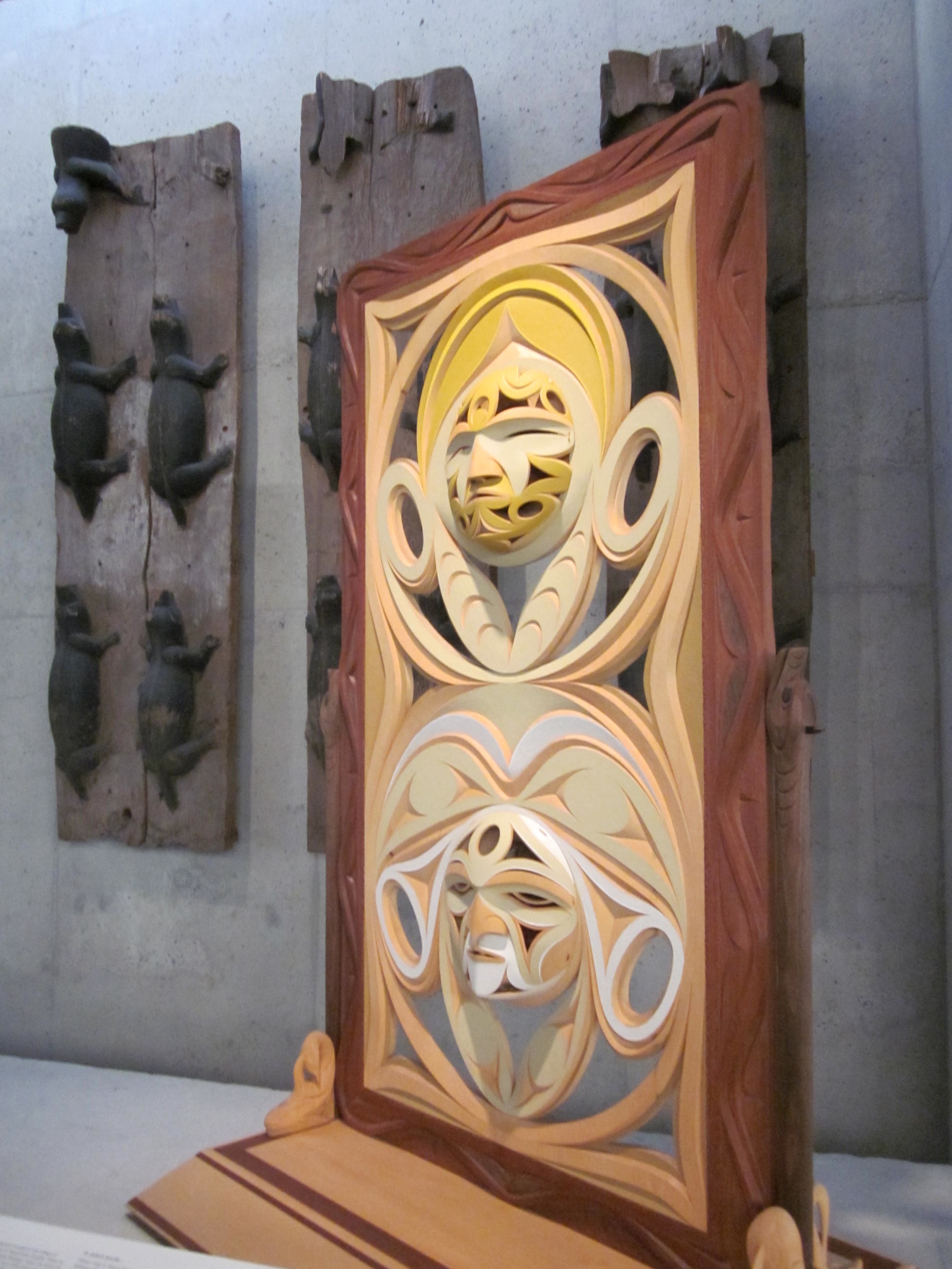 While Vancouver’s mosaic tiles may be semi-precious gems, the Museum of Anthropology on the University of British Columbia campus is a diamond, emerald and ruby all in one. Just as strolling through the city earlier this week yielded aha’s from our sidewalk mosaic discoveries, walking through the museum’s “Multiversity Galleries” gave us the opportunity to unearth many treasures by simply pulling open the drawers in cabinets found under the displays.