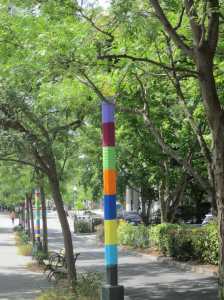 At last our city has been bombed.  No one has been hurt, because the bombs have been constructed with material not known to be dangerous, except to the wallets of those who buy it.  I’m talking about “yarn bombs,” or what are also called “knitted graffiti.”  Wikipedia tells us that the idea for creating colorful covers for urban trees, pipes, poles and phone boxes may have come from a Houston, Texas knitter.  (Follow the link for photos of  yarn bombs in the UK, Finland, New York City, Latvia, and Seattle.)  As the story goes, people were looking for “a creative way to use their leftover yarn and unfinished knitting projects.”  Whatever its origins, the idea has spread around the world.  Read the New York Times article in the Seattle Times for more background on yarn bombing.