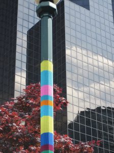 The knitting attack in these photos did not come about spontaneously.  Our county’s arts agency has provided support as have cities and private businesses.  I imagine the goal is to make public places more interesting, colorful and cheery.  We need extra color in this green and gray environment, where the sun is not aggressive enough to push away the cloud cover until dinnertime.  What is most fun about our light pole cozies is the element of surprise.  Suddenly I’m noticing objects I have been ignoring for years. I applaud the invisible knitters who are making familiar walkways more exciting. And for friends who are always saying, “We can do that,” when they come across  a creative project, my response will be to show them a photo of the sweater I once knitted for my father that would have fit an elephant.