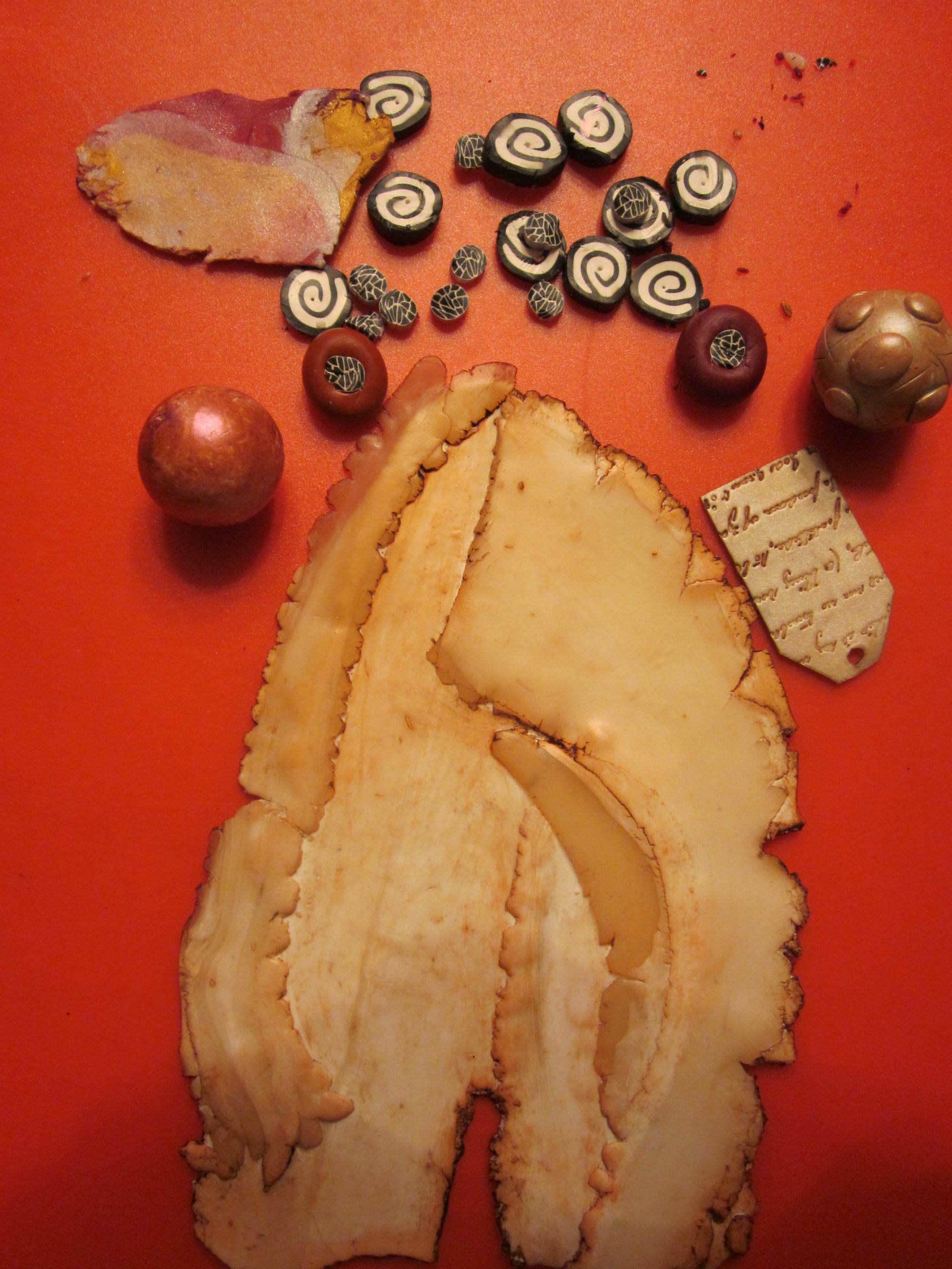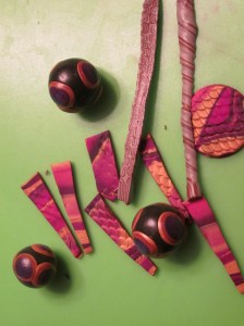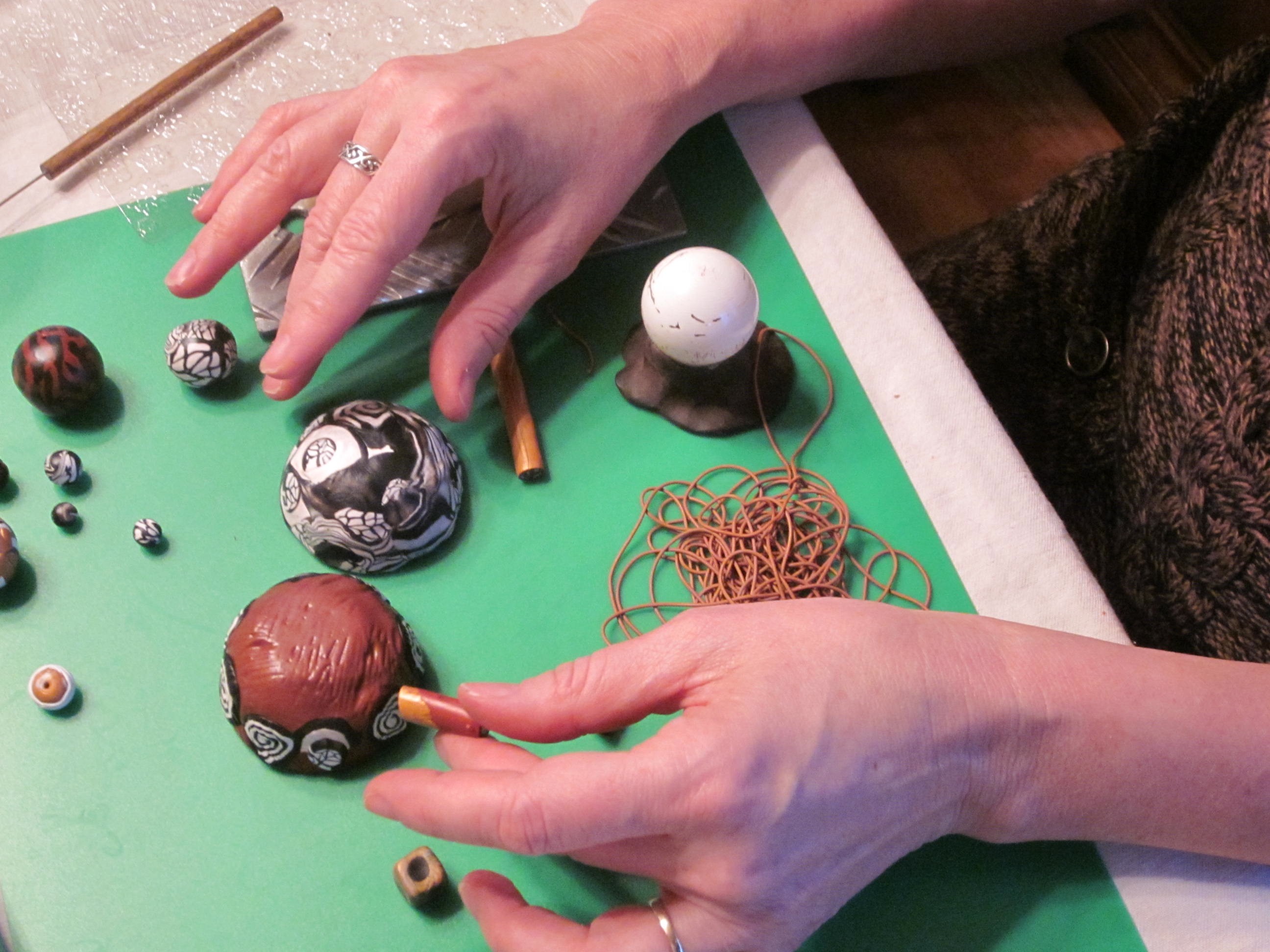 The ten-hour event passed quickly. It didn’t hurt that two other players were fabric artists. I could always borrow ideas from them. Nothing else in your life matters when you’re rolling sheets of polymer through the lasagna setting of a pasta maker, mixing red and black clay and hoping it doesn’t turn brown, trying to roll a round bead or stick little balls of clay onto a big ball. You can’t help but focus on your work. It’s a series of Zen moments. Two players skipped work, one traveled from out-of-town and two of us were retired. All of us have responsibilities. None of us left on time and we all asked if we could do it again. Are play dates, like youth, wasted on the young? Probably not, but it seems to me that adults need them as much or more than kids.