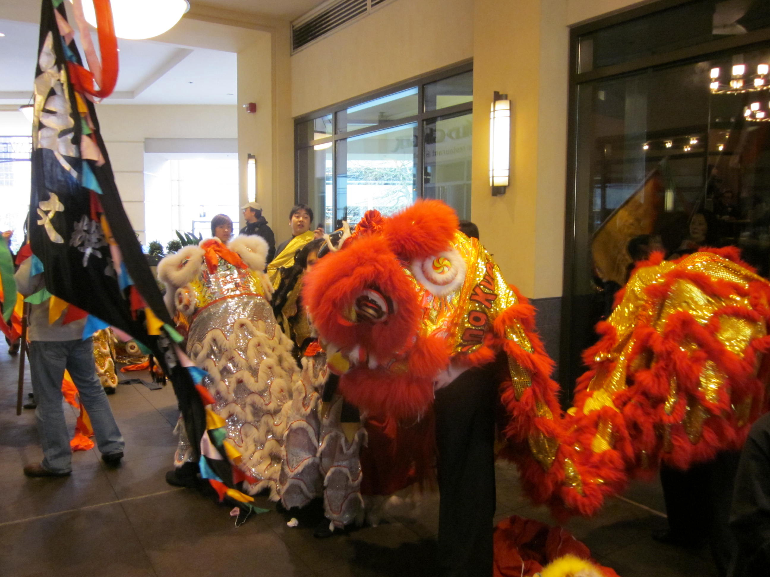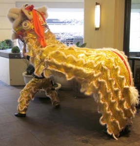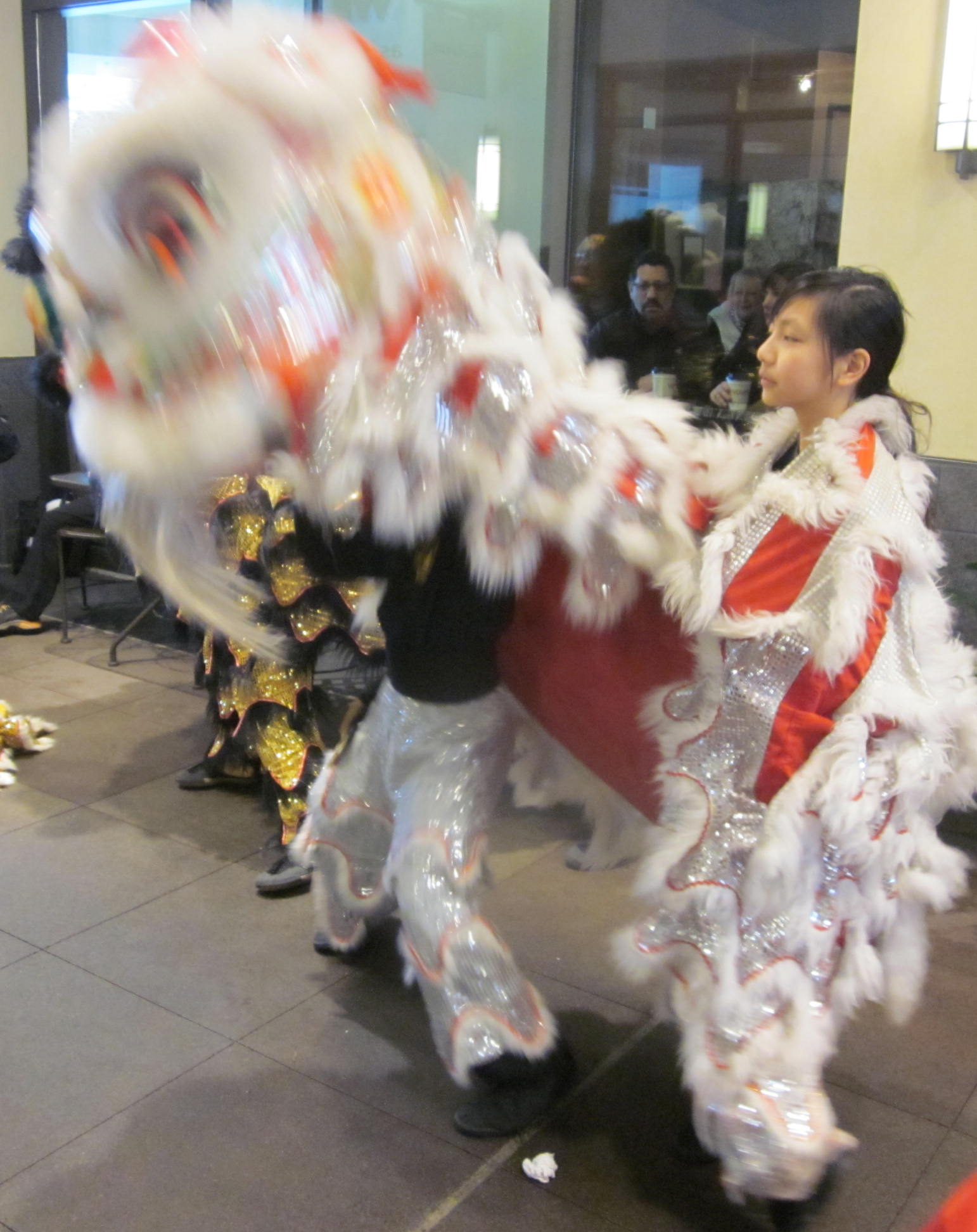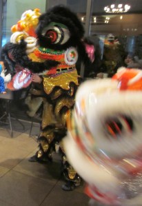 After staying inside for three days to avoid snow and ice, we ventured out into slush and wind to see a Lion Dance performed by five lions ranging in size from tiny to large. (Both the lions and the performers fit this description.) All the lions were lively, jumping up and down to the accompaniment of drum, gong, and cymbals to celebrate the New Year, ward off evil spirits and bring good luck. According to one source, Lion dances in the U.S. trace their roots to Guangdong Province, Southern China. One distinguishing feature of the Southern lion is his “dramatic head thrusts.” These head thrusts account for the fact that most of the photos I took were blurry.