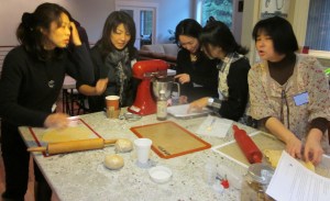 This lowered our stress levels (mine started out low, because we were in someone else’s kitchen this year) and gave the students plenty of time to make icing and decorate both kinds of treats. The group made rugelach, a Jewish dessert, together. It’s a rolled crescent-shaped cookie made from dough filled with a mixture of marmalade, nuts and cinnamon.