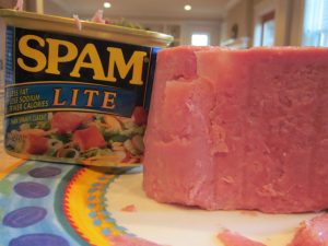 Most Americans my age have had a Spam experience some time in their lives.  When I was little, my mother packed it for camping trips.  Years ago I included it in my emergency kit — the bag of supplies squirreled away in the trunk of my car to sustain me if the earth shakes, as it has a tendency to do every so often.  My idea was that if stranded at work without heat or light for several days I could always open my can of pork, ham and mechanically separated chicken and soon feel sated, as well as really, really thirsty.  A long time later, I checked my kit to see whether the items in it could still be eaten or drunk.  The Spam was the only food with a label claiming that it had years to go before it spoiled.  “Let’s try it,” my husband and I said at the time.  Neither of us could remember the taste from childhood, but it took only one bite to remind me that Spam is a lot like salted caramels, but without the caramels.