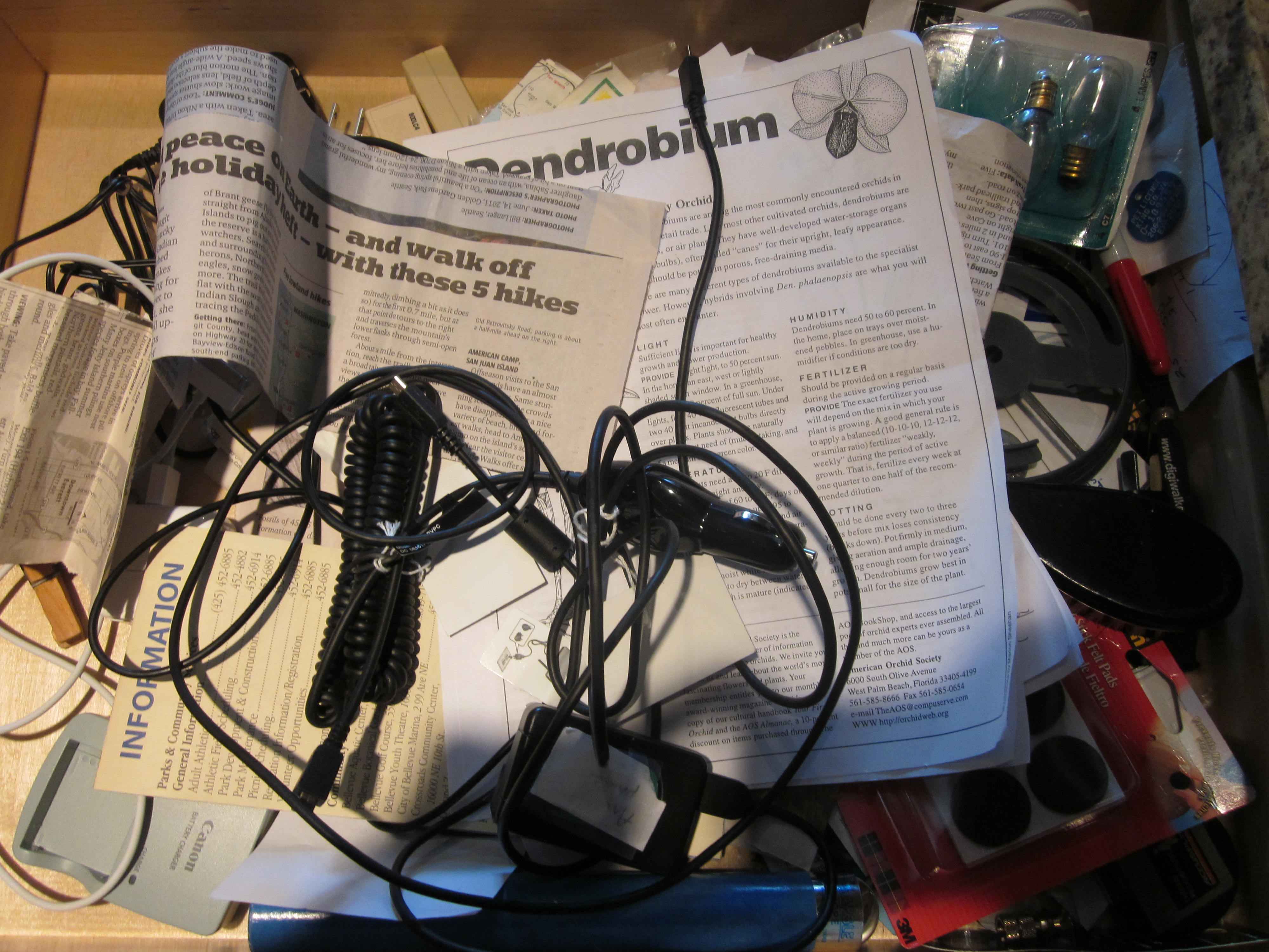 Despite my vow to de-clutter two more spaces, using the fifteen-minute a day strategy designed to turn what seems to be an overwhelming problem into something manageable, I have been too busy hosting parties lately, thereby creating more messes rather than cleaning them up. I’m sure this problem increased my receptivity to additional anti-clutter information from The Happiness Project. Rubin divided household clutter into eight categories. See how many items in these groups you can find in your home. I think I could find all eight if I looked in every drawer or closet, which I won’t do because I would find the experience exhausting and depressing.