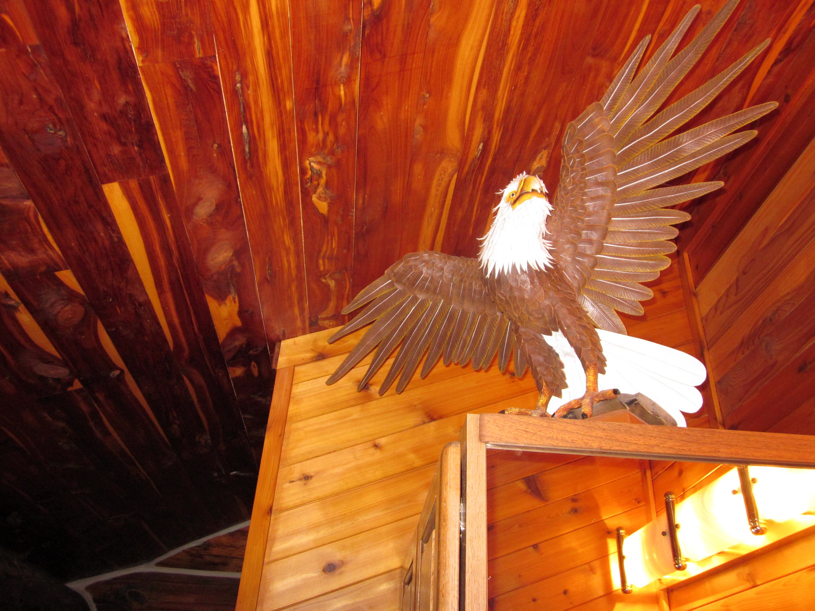 an eagle made out of an indeterminate substance, and a wagon wheel suspended from the ceiling. Our second night there, after spending an entire day out of doors under an expansive sky, my husband shouted, “I’m going stir crazy.” It may have been the room.