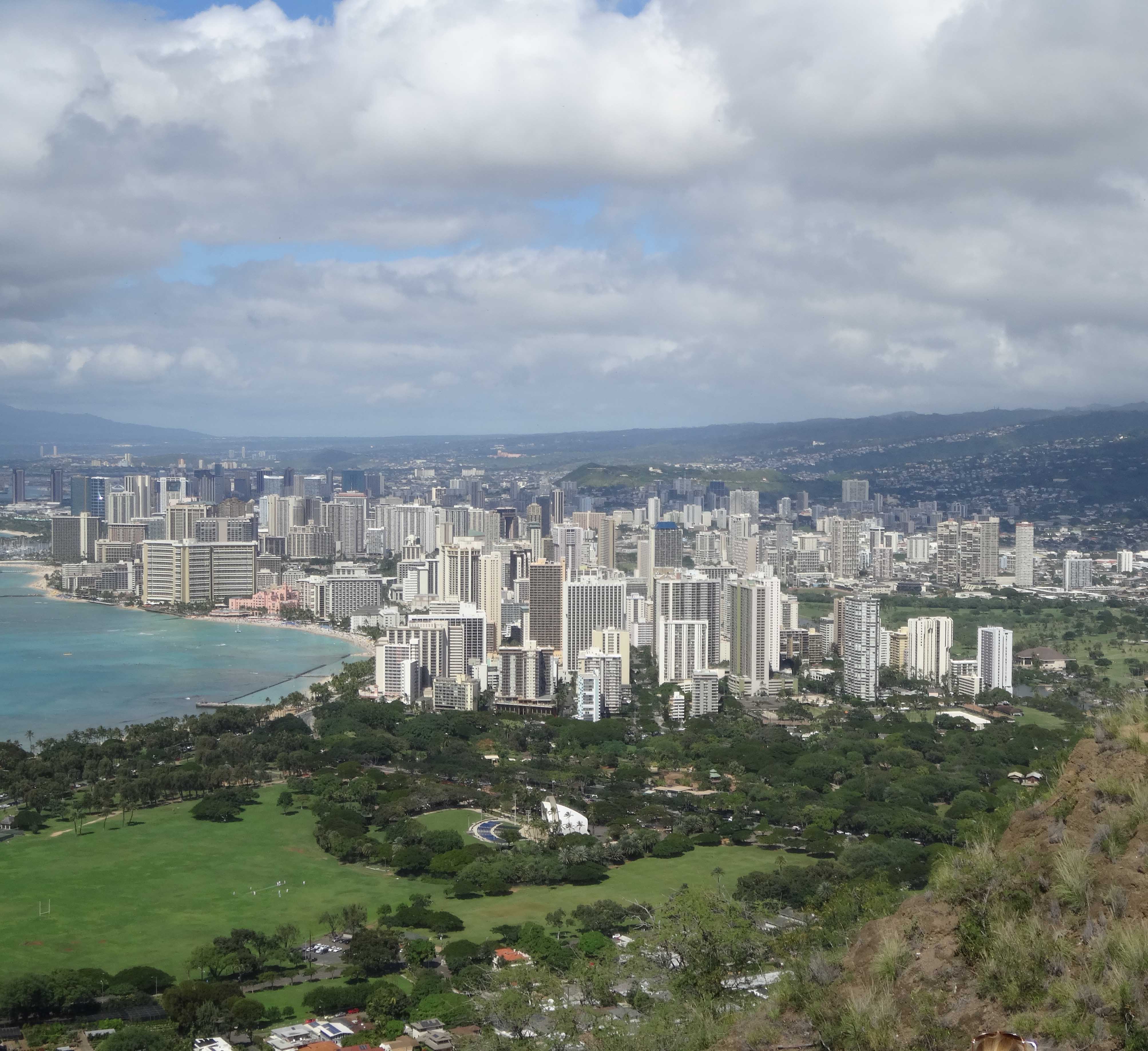 But back to the crater of Diamond Head, also known as Le’ahi. Encountering stairs mid-way up reminded us of the earlier hikes and a dark narrow tunnel brought back memories of being inside the pyramid at Chichen Itza. The Oahu park system brochure says that the Diamond Head hike, “0.8 mile from trailhead to the summit is steep and strenuous, gaining 560 feet as it ascends from the crater floor.” A woman in the park gatehouse told me that on a moderately busy day, three thousand people make the climb. Watching hordes of people of all ages and physical condition reach the top, we were determined to make it. In eighty-plus degree weather, we worked up a sweat, but compared to the other hikes I’ve mentioned, this one was relatively easy. Definitely safer and not strenuous enough to push out the vivid memories of the old ones.