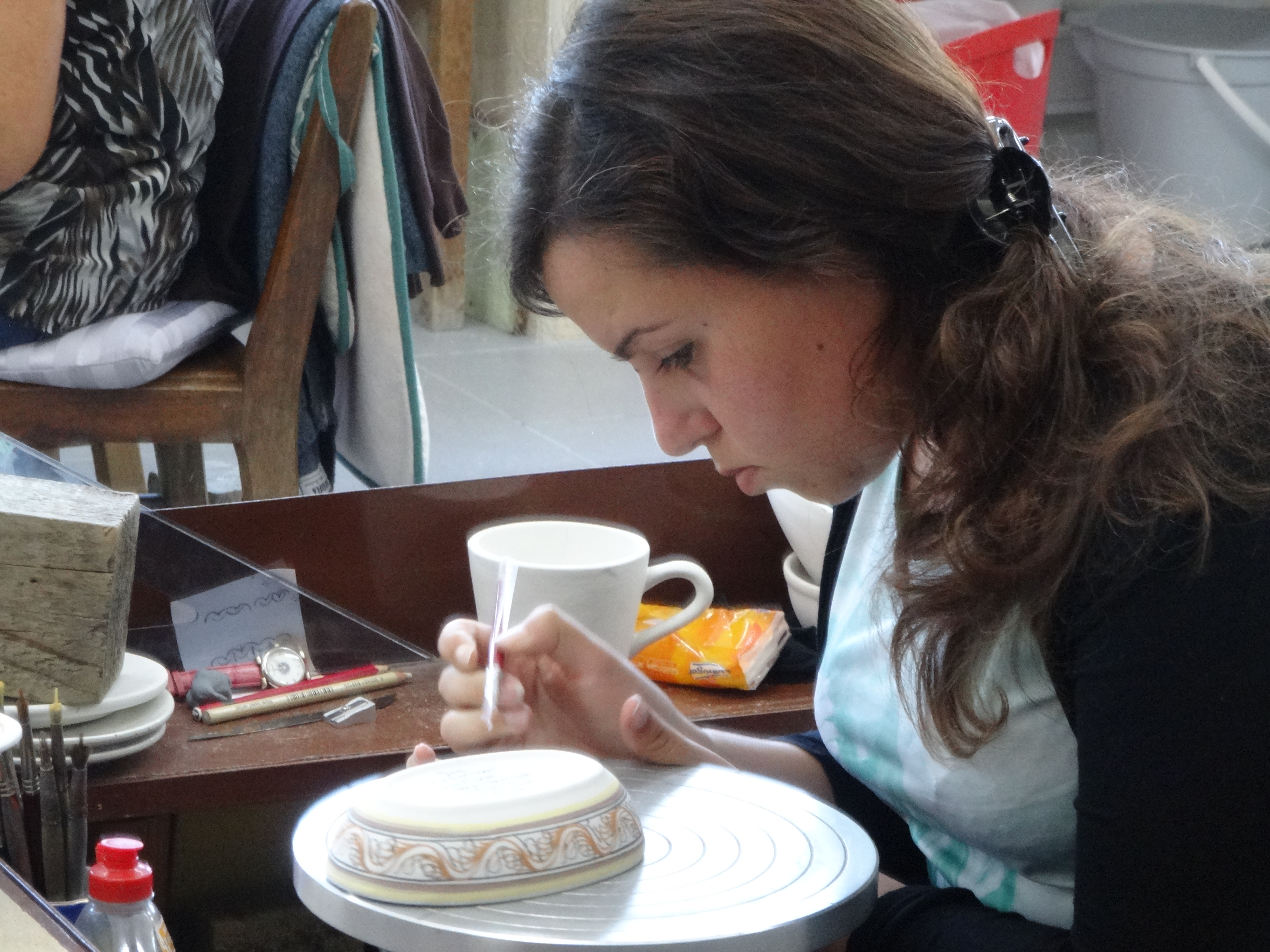 After the tour, our guide, Cristina, ushered us into the factory lunchroom. There she gave each of us a white tile. Our instructions? Simply turn out a beautifully decorated tile and finish before the employees needed the space for lunch, that is, in twenty or twenty-five minutes.