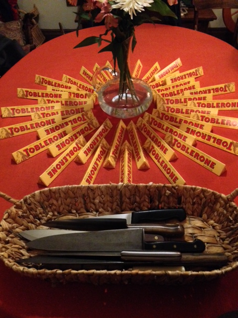 In honor of her 95th birthday, which she celebrated yesterday, she shared hostess gifts of Toblerone chocolate and kitchen knives.  Well, not all were kitchen knives.  A few looked like daggers and there was one cleaver.