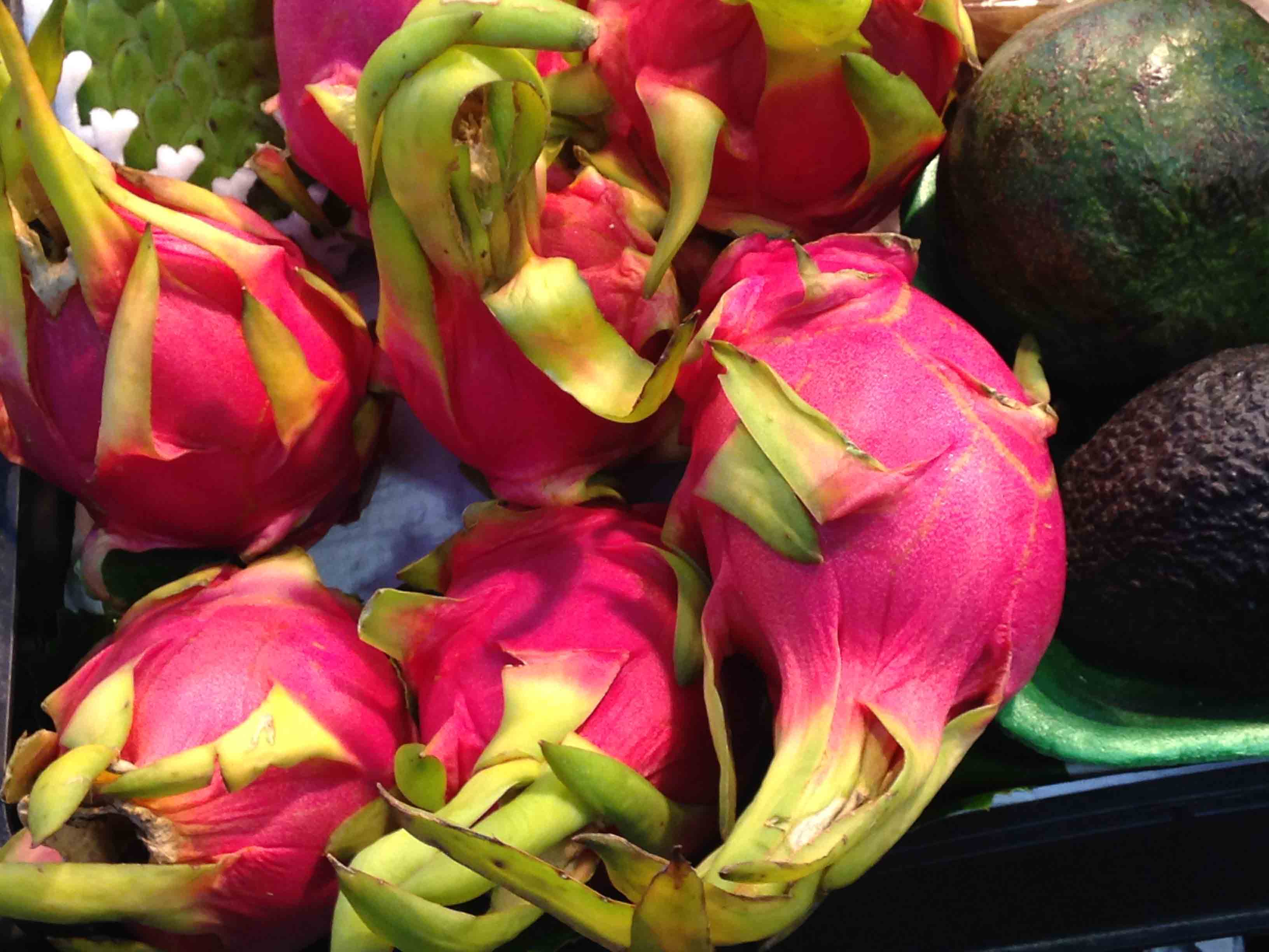 Hello again! That strange pink fruit is a dragon fruit, also called pitaya. They come in two varieties: white flesh and magenta, both with black seeds. The white tastes like a weaker version of kiwi, the red has a bit more flavor a little like a beet. They are actually fruit from a sprawling catus plant, and considered very healthy abet a bit bland after their colorful buildup.