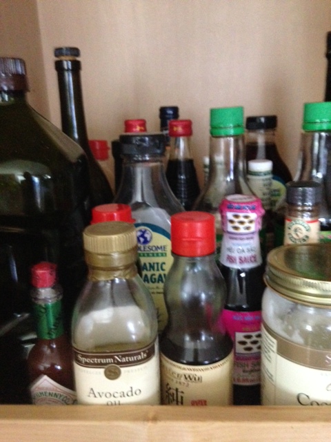 oilOils also create confusion in my cupboard.  One canola and three olive oils fight for space with avocado, sesame, and coconut oil. And then there are the sauces.