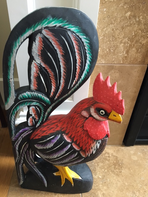 Since then, we have photographed roosters in Portugal, Iceland, and the U.S., bought rooster memorabilia, and even purchased a loyal wooden rooster who silently guards the fireplace hearth.