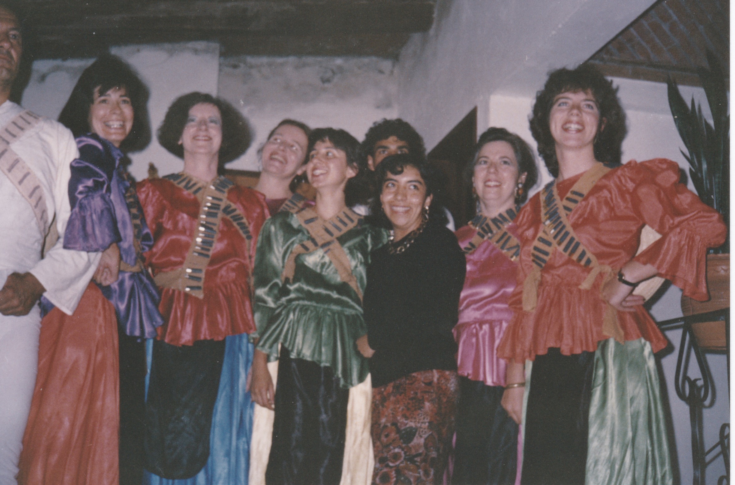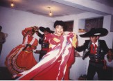 Since it was Mexico, we couldn’t observe an eclipse without a party, so the school’s director, Jorge Barroso, hosted La Fiesta del Eclipse on the morning of the event. A week or so before the eclipse, he hired a professional folkloric dancer named Sofia (center front in both photos) to teach the women students a traditional dance. She even managed to find matching costumes to fit all of us, who were not exactly petite. The dance she chose was La Danza de Las Tortugas, dance of the turtles, which originated in the eastern state of Veracruz.  (I’m the second tortuga from the left.) All I remember about the dance is that we were supposed to be depositing our eggs on the beach.