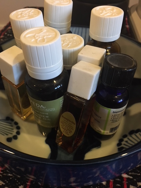Uncluttered didn’t work out according to plan, but peaceful and quiet are still good descriptors.  Among the items I moved there were my collection of essential oils purchased in another era and the aromatherapy diffuser. When heated, the oils soothe, comfort and cover up the odor of the cat’s litter box, which is also in that room.