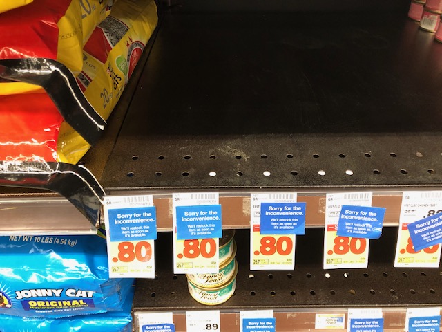 We’re switching our kitty from Fancy Feast to Healthy Gourmet. Although that’s not primarily due to shortages. Several months ago we switched to Fancy Feast because Oreo liked it better. On the advice of the veterinarian’s scale, we are now switching her back to something she doesn’t like quite so much.