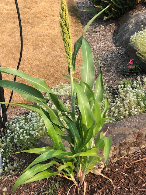 In an attempt to be encouraging, a neighbor, who’s grown corn herself, suggested we might be growing feed corn for livestock (useful for a neighborhood with many small dogs and one orange cat), or possibly something we could pop and slather with butter.  But it’s neither. What’s appeared most recently is not silk, but growths that look like feather dusters of tiny seeds.