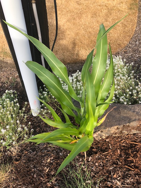 Hours of gazing at small photos of corn stalks on the internet led me to conclude that while our plant has leaves like a corn plant, it’s not corn.
