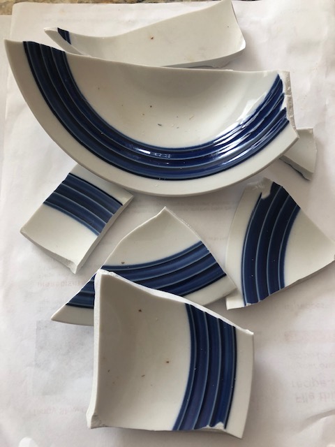 Last week, when I accidentally dropped and broke the cat’s dish, my obsession with kintsugi returned. The broken dish provided a “golden opportunity” to try kintsugi. The cat had a spare dish and wasn’t going to fret over the loss as long as the food continued to come. A web search revealed interesting surprises. I could purchase pre-broken and repaired pieces of pottery. No need to damage a bowl or plate myself. But the purchased repairs would have no personal meaning. Then, for the DIYers, there were the kintsugi repair kits, ranging in price from $18 to $129.  I worried that after spending the money I’d find my repair job lacking.